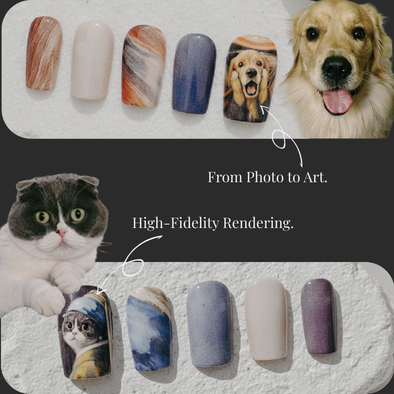 Transform your love into a custom pet portrait press-on nail masterpiece. From an everyday snapshot to unique, gallery-inspired wearable nail art, we bring your vision to life. We don’t just recreate your pet’s silhouette; we illuminate the bond between you and your furry friend through personalized manicure designs. Keep your beloved pet close—right where your heart meets your hands.